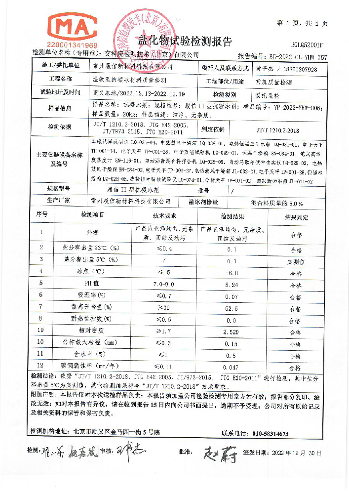 江蘇履信新材料科技有限公司系江蘇省民營創新型科技企業,主要研發、生產、銷售各種路面融雪、抗凝冰系列產品。公司注冊資本1000萬元,擁有占地100畝廠房和成套生產線,擁有各種配套的研發、檢測設備。公司現有本科以上學歷的研發人員20人,其中博士3人、碩士10人;擁有多項完全自主知識產權科研成果和世界發明專利。產品被全國各省市和日本、俄羅斯、韓國等國家廣泛應用于公路、橋梁、機場、碼頭的融雪抑冰保障,產生了很好的經濟效益和社會效益。公司先后與南京大學、清華大學、浙江大學和中鹽集團等高校及科研院所深度合作,開發出了全新的、擁有自主知識產權的溫敏型抗凝冰系列產品,并獲得了國際PCT專利;有多項科研成果獲得